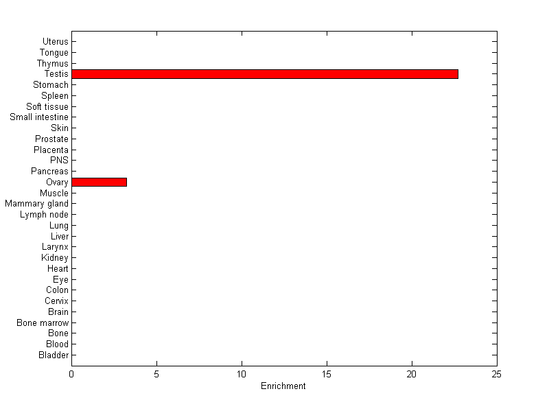 The expression level is normalized with tissue-library size. Each value for a gene in a tissue is a ratio of observed ESTs to the expected one in this tissue. The expected number of ESTs is the product of total ESTs of the gene and the fraction of total ESTs in the tissue among all ESTs in 30 tissues.