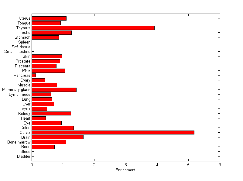 The expression level is normalized with tissue-library size. Each value for a gene in a tissue is a ratio of observed ESTs to the expected one in this tissue. The expected number of ESTs is the product of total ESTs of the gene and the fraction of total ESTs in the tissue among all ESTs in 30 tissues.