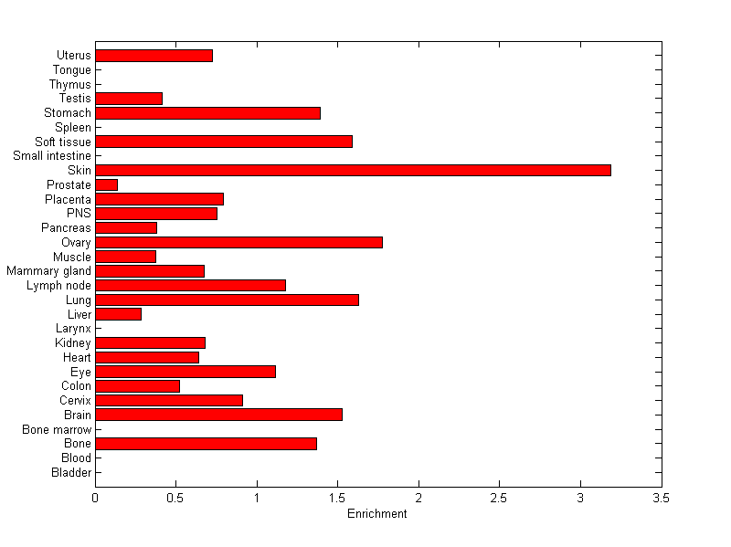 The expression level is normalized with tissue-library size. Each value for a gene in a tissue is a ratio of observed ESTs to the expected one in this tissue. The expected number of ESTs is the product of total ESTs of the gene and the fraction of total ESTs in the tissue among all ESTs in 30 tissues.