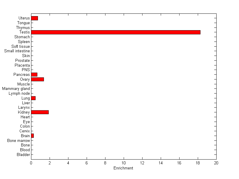 The expression level is normalized with tissue-library size. Each value for a gene in a tissue is a ratio of observed ESTs to the expected one in this tissue. The expected number of ESTs is the product of total ESTs of the gene and the fraction of total ESTs in the tissue among all ESTs in 30 tissues.