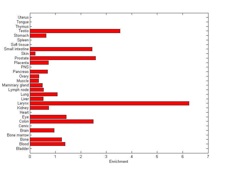 The expression level is normalized with tissue-library size. Each value for a gene in a tissue is a ratio of observed ESTs to the expected one in this tissue. The expected number of ESTs is the product of total ESTs of the gene and the fraction of total ESTs in the tissue among all ESTs in 30 tissues.