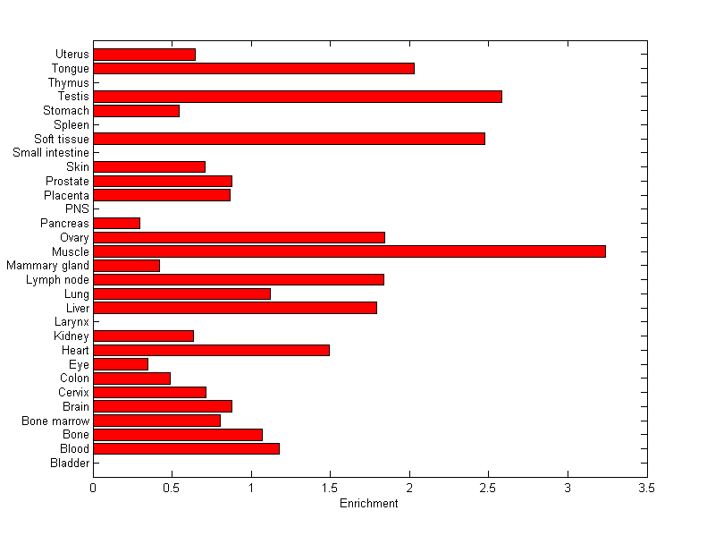 The expression level is normalized with tissue-library size. Each value for a gene in a tissue is a ratio of observed ESTs to the expected one in this tissue. The expected number of ESTs is the product of total ESTs of the gene and the fraction of total ESTs in the tissue among all ESTs in 30 tissues.