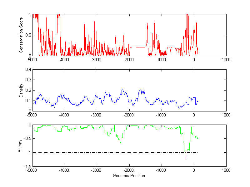 The energy profile (green curve) is about energy for module detection based on TF interaction. The positions with energy less than -1 indicate the existence of CRMs.