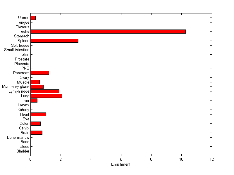 The expression level is normalized with tissue-library size. Each value for a gene in a tissue is a ratio of observed ESTs to the expected one in this tissue. The expected number of ESTs is the product of total ESTs of the gene and the fraction of total ESTs in the tissue among all ESTs in 30 tissues.