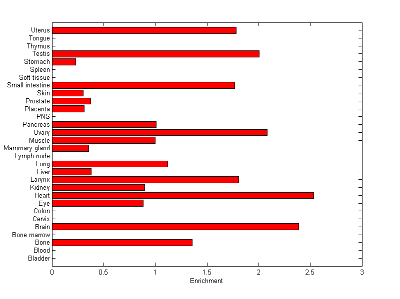The expression level is normalized with tissue-library size. Each value for a gene in a tissue is a ratio of observed ESTs to the expected one in this tissue. The expected number of ESTs is the product of total ESTs of the gene and the fraction of total ESTs in the tissue among all ESTs in 30 tissues.