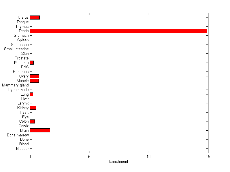 The expression level is normalized with tissue-library size. Each value for a gene in a tissue is a ratio of observed ESTs to the expected one in this tissue. The expected number of ESTs is the product of total ESTs of the gene and the fraction of total ESTs in the tissue among all ESTs in 30 tissues.