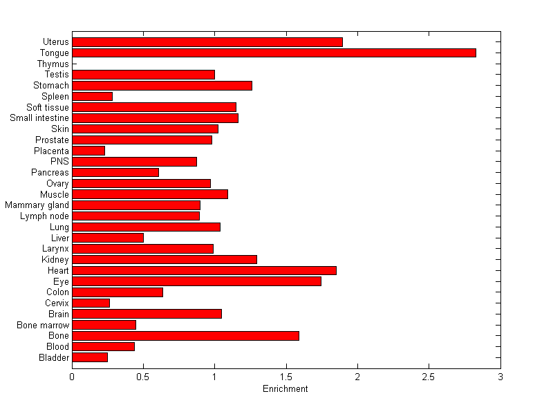 The expression level is normalized with tissue-library size. Each value for a gene in a tissue is a ratio of observed ESTs to the expected one in this tissue. The expected number of ESTs is the product of total ESTs of the gene and the fraction of total ESTs in the tissue among all ESTs in 30 tissues.