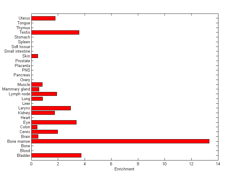 The expression level is normalized with tissue-library size. Each value for a gene in a tissue is a ratio of observed ESTs to the expected one in this tissue. The expected number of ESTs is the product of total ESTs of the gene and the fraction of total ESTs in the tissue among all ESTs in 30 tissues.