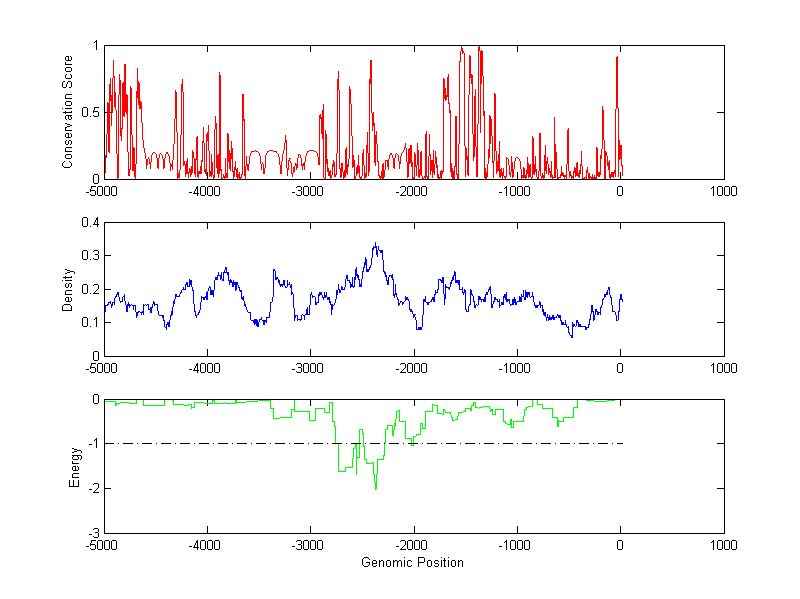 The energy profile (green curve) is about energy for module detection based on TF interaction. The positions with energy less than -1 indicate the existence of CRMs.
