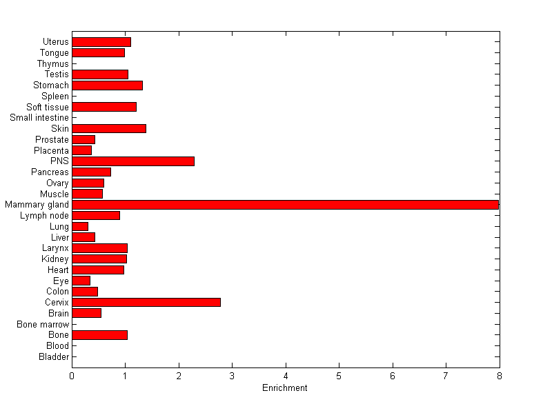 The expression level is normalized with tissue-library size. Each value for a gene in a tissue is a ratio of observed ESTs to the expected one in this tissue. The expected number of ESTs is the product of total ESTs of the gene and the fraction of total ESTs in the tissue among all ESTs in 30 tissues.