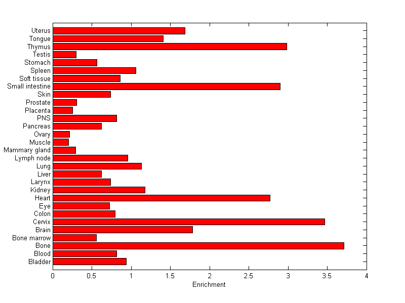The expression level is normalized with tissue-library size. Each value for a gene in a tissue is a ratio of observed ESTs to the expected one in this tissue. The expected number of ESTs is the product of total ESTs of the gene and the fraction of total ESTs in the tissue among all ESTs in 30 tissues.