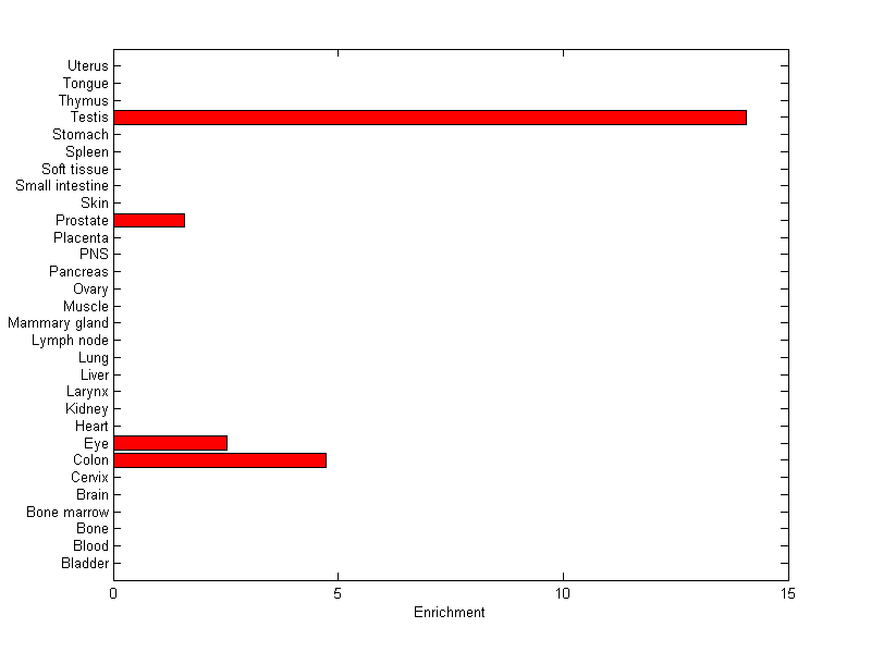 About the profile: The expression level is normalized with tissue-library size. Each value for a gene in a tissue is a ratio of observed ESTs to the expected one in this tissue. The expected number of ESTs is the product of total ESTs of the gene and the fraction of total ESTs in the tissue among all ESTs in 30 tissues. Summary: This gene is preferentially expressed in [testis] Download: |