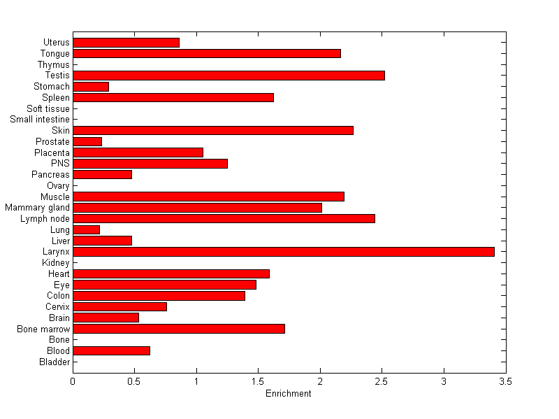 The expression level is normalized with tissue-library size. Each value for a gene in a tissue is a ratio of observed ESTs to the expected one in this tissue. The expected number of ESTs is the product of total ESTs of the gene and the fraction of total ESTs in the tissue among all ESTs in 30 tissues.