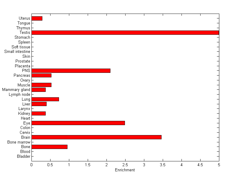 The expression level is normalized with tissue-library size. Each value for a gene in a tissue is a ratio of observed ESTs to the expected one in this tissue. The expected number of ESTs is the product of total ESTs of the gene and the fraction of total ESTs in the tissue among all ESTs in 30 tissues.