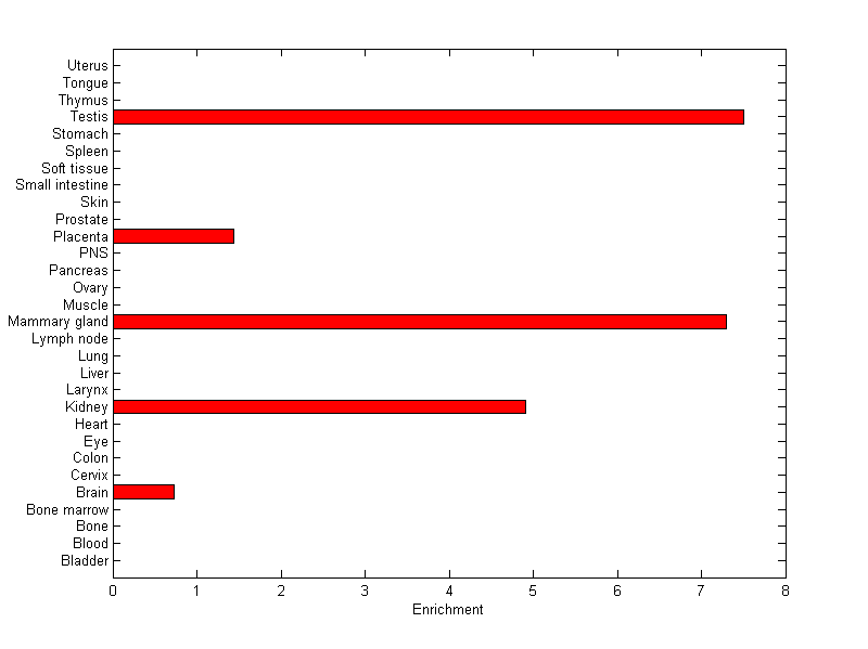 The expression level is normalized with tissue-library size. Each value for a gene in a tissue is a ratio of observed ESTs to the expected one in this tissue. The expected number of ESTs is the product of total ESTs of the gene and the fraction of total ESTs in the tissue among all ESTs in 30 tissues.