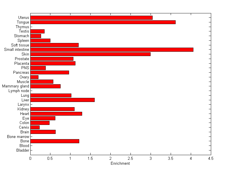 The expression level is normalized with tissue-library size. Each value for a gene in a tissue is a ratio of observed ESTs to the expected one in this tissue. The expected number of ESTs is the product of total ESTs of the gene and the fraction of total ESTs in the tissue among all ESTs in 30 tissues.