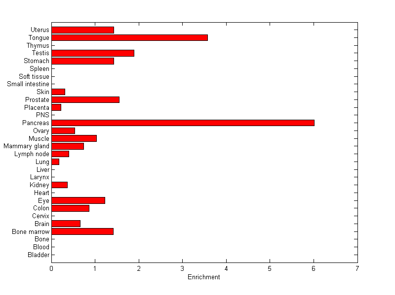 The expression level is normalized with tissue-library size. Each value for a gene in a tissue is a ratio of observed ESTs to the expected one in this tissue. The expected number of ESTs is the product of total ESTs of the gene and the fraction of total ESTs in the tissue among all ESTs in 30 tissues.