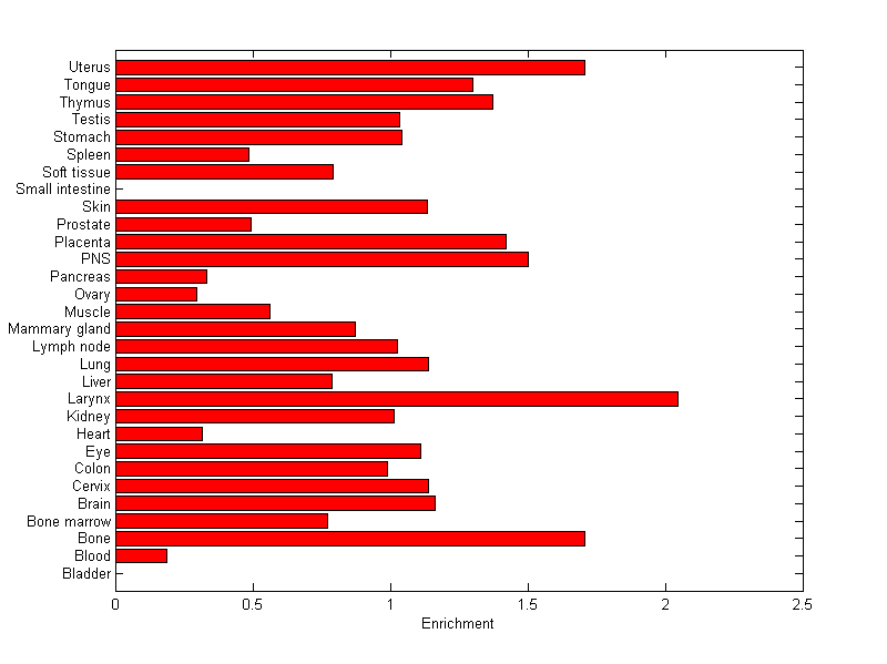 The expression level is normalized with tissue-library size. Each value for a gene in a tissue is a ratio of observed ESTs to the expected one in this tissue. The expected number of ESTs is the product of total ESTs of the gene and the fraction of total ESTs in the tissue among all ESTs in 30 tissues.