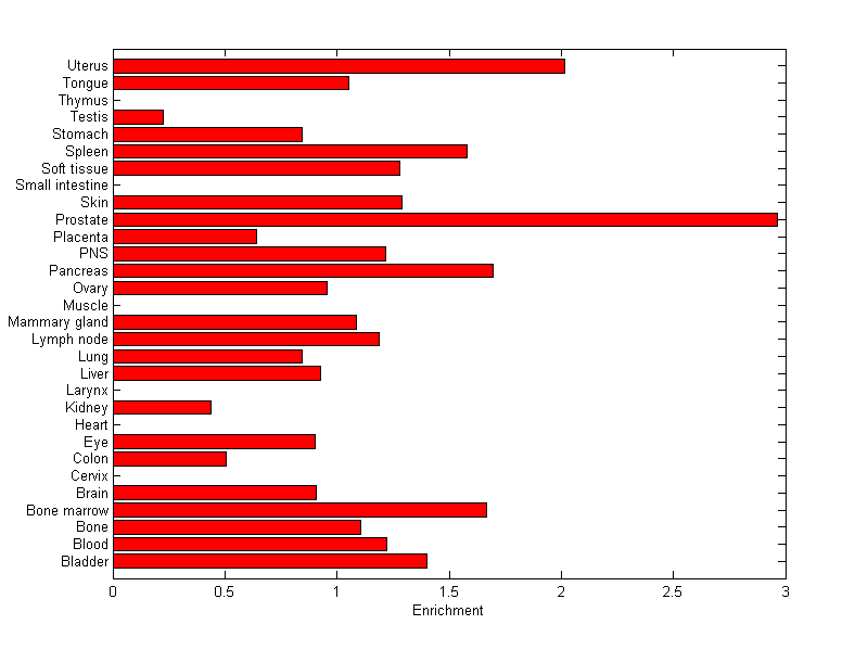 The expression level is normalized with tissue-library size. Each value for a gene in a tissue is a ratio of observed ESTs to the expected one in this tissue. The expected number of ESTs is the product of total ESTs of the gene and the fraction of total ESTs in the tissue among all ESTs in 30 tissues.