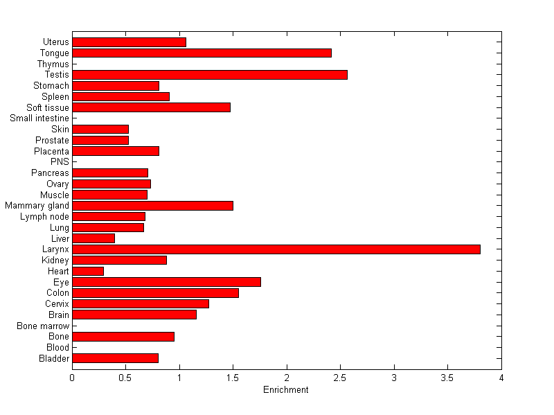 The expression level is normalized with tissue-library size. Each value for a gene in a tissue is a ratio of observed ESTs to the expected one in this tissue. The expected number of ESTs is the product of total ESTs of the gene and the fraction of total ESTs in the tissue among all ESTs in 30 tissues.