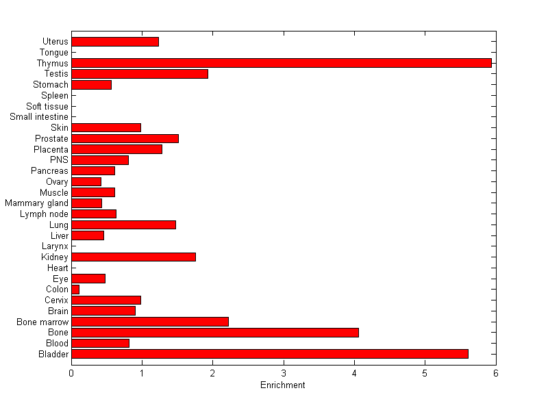 The expression level is normalized with tissue-library size. Each value for a gene in a tissue is a ratio of observed ESTs to the expected one in this tissue. The expected number of ESTs is the product of total ESTs of the gene and the fraction of total ESTs in the tissue among all ESTs in 30 tissues.