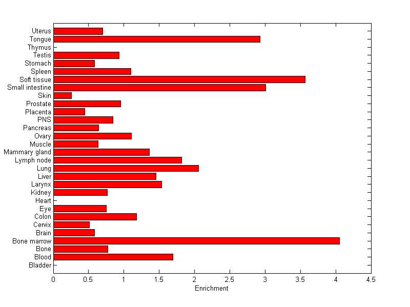 The expression level is normalized with tissue-library size. Each value for a gene in a tissue is a ratio of observed ESTs to the expected one in this tissue. The expected number of ESTs is the product of total ESTs of the gene and the fraction of total ESTs in the tissue among all ESTs in 30 tissues.