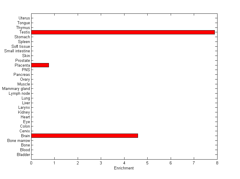 The expression level is normalized with tissue-library size. Each value for a gene in a tissue is a ratio of observed ESTs to the expected one in this tissue. The expected number of ESTs is the product of total ESTs of the gene and the fraction of total ESTs in the tissue among all ESTs in 30 tissues.