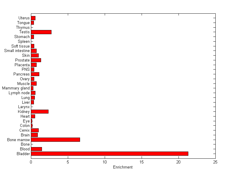 The expression level is normalized with tissue-library size. Each value for a gene in a tissue is a ratio of observed ESTs to the expected one in this tissue. The expected number of ESTs is the product of total ESTs of the gene and the fraction of total ESTs in the tissue among all ESTs in 30 tissues.