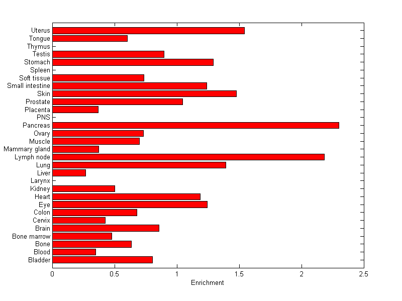 The expression level is normalized with tissue-library size. Each value for a gene in a tissue is a ratio of observed ESTs to the expected one in this tissue. The expected number of ESTs is the product of total ESTs of the gene and the fraction of total ESTs in the tissue among all ESTs in 30 tissues.
