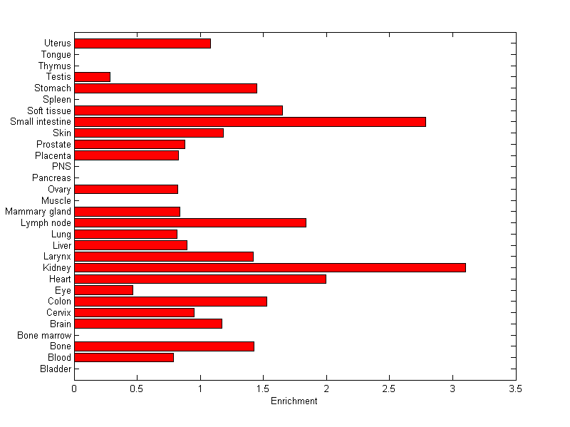 The expression level is normalized with tissue-library size. Each value for a gene in a tissue is a ratio of observed ESTs to the expected one in this tissue. The expected number of ESTs is the product of total ESTs of the gene and the fraction of total ESTs in the tissue among all ESTs in 30 tissues.