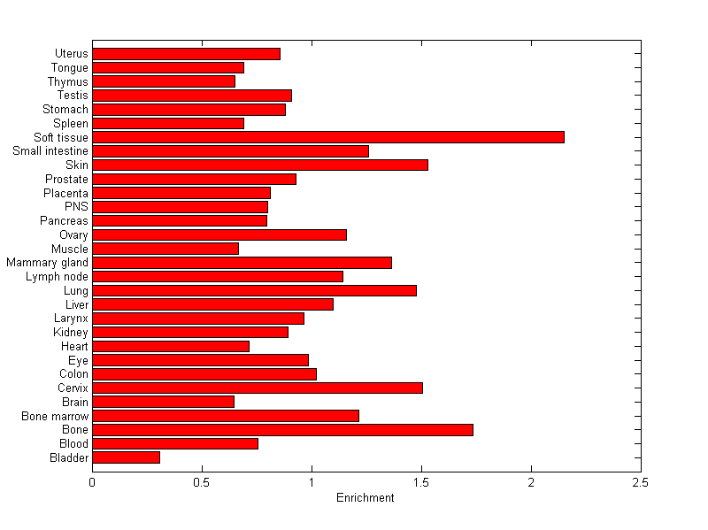 The expression level is normalized with tissue-library size. Each value for a gene in a tissue is a ratio of observed ESTs to the expected one in this tissue. The expected number of ESTs is the product of total ESTs of the gene and the fraction of total ESTs in the tissue among all ESTs in 30 tissues.