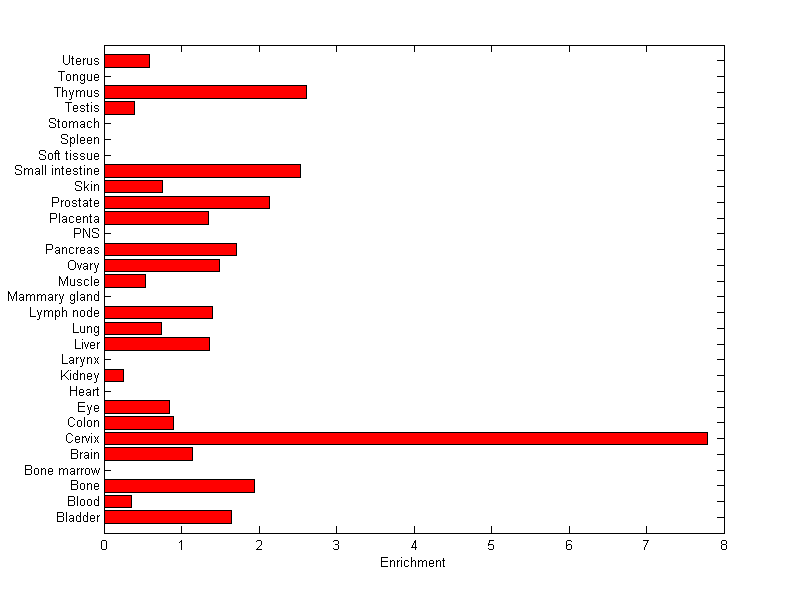 The expression level is normalized with tissue-library size. Each value for a gene in a tissue is a ratio of observed ESTs to the expected one in this tissue. The expected number of ESTs is the product of total ESTs of the gene and the fraction of total ESTs in the tissue among all ESTs in 30 tissues.