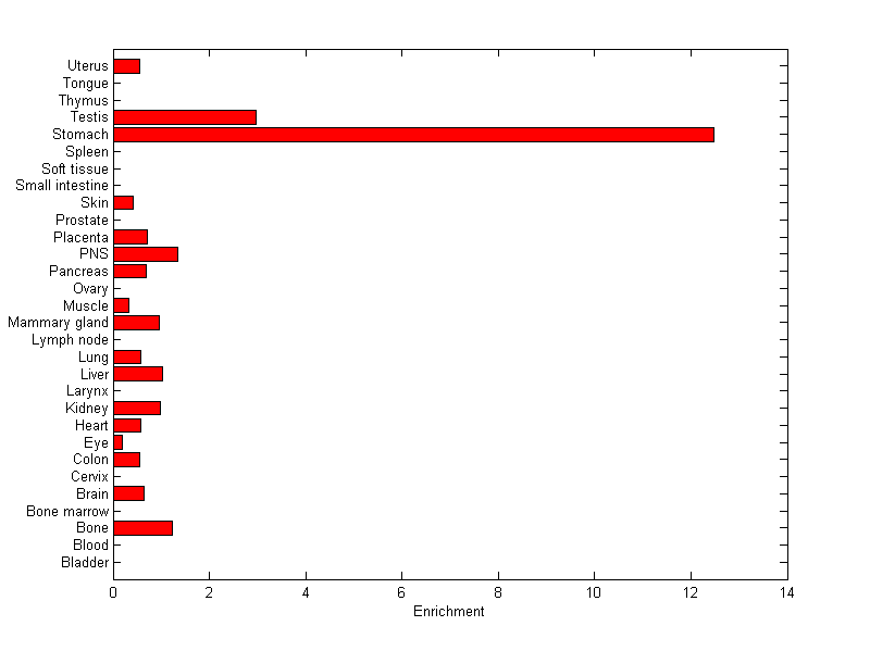 The expression level is normalized with tissue-library size. Each value for a gene in a tissue is a ratio of observed ESTs to the expected one in this tissue. The expected number of ESTs is the product of total ESTs of the gene and the fraction of total ESTs in the tissue among all ESTs in 30 tissues.