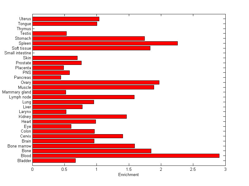 The expression level is normalized with tissue-library size. Each value for a gene in a tissue is a ratio of observed ESTs to the expected one in this tissue. The expected number of ESTs is the product of total ESTs of the gene and the fraction of total ESTs in the tissue among all ESTs in 30 tissues.