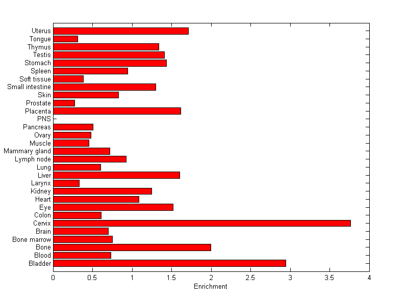 The expression level is normalized with tissue-library size. Each value for a gene in a tissue is a ratio of observed ESTs to the expected one in this tissue. The expected number of ESTs is the product of total ESTs of the gene and the fraction of total ESTs in the tissue among all ESTs in 30 tissues.