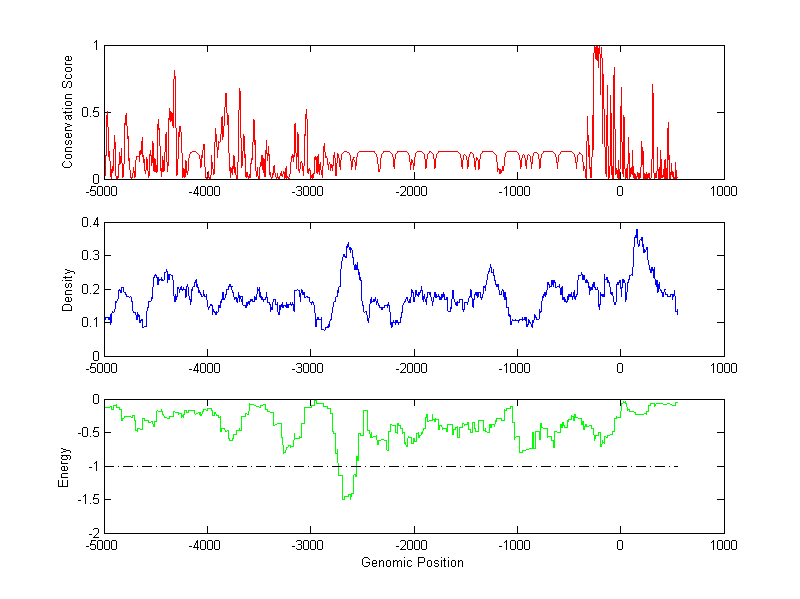 The energy profile (green curve) is about energy for module detection based on TF interaction. The positions with energy less than -1 indicate the existence of CRMs.