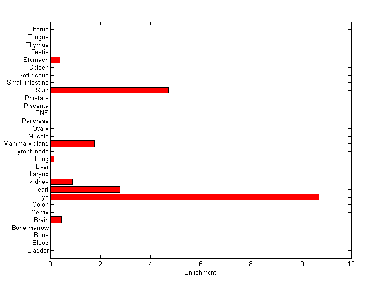 The expression level is normalized with tissue-library size. Each value for a gene in a tissue is a ratio of observed ESTs to the expected one in this tissue. The expected number of ESTs is the product of total ESTs of the gene and the fraction of total ESTs in the tissue among all ESTs in 30 tissues.