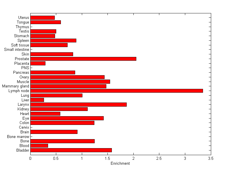 The expression level is normalized with tissue-library size. Each value for a gene in a tissue is a ratio of observed ESTs to the expected one in this tissue. The expected number of ESTs is the product of total ESTs of the gene and the fraction of total ESTs in the tissue among all ESTs in 30 tissues.