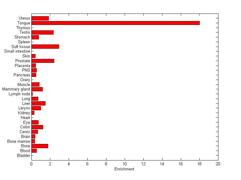 The expression level is normalized with tissue-library size. Each value for a gene in a tissue is a ratio of observed ESTs to the expected one in this tissue. The expected number of ESTs is the product of total ESTs of the gene and the fraction of total ESTs in the tissue among all ESTs in 30 tissues.