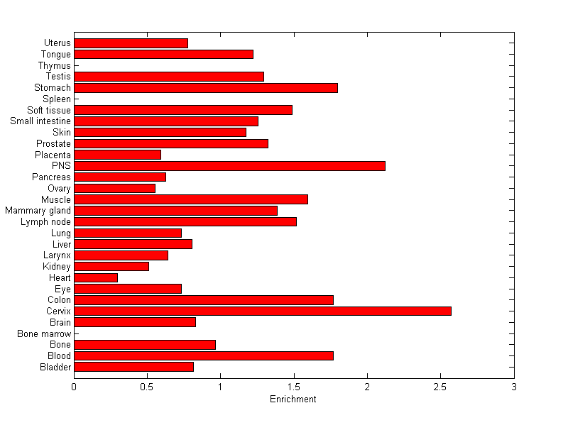 The expression level is normalized with tissue-library size. Each value for a gene in a tissue is a ratio of observed ESTs to the expected one in this tissue. The expected number of ESTs is the product of total ESTs of the gene and the fraction of total ESTs in the tissue among all ESTs in 30 tissues.
