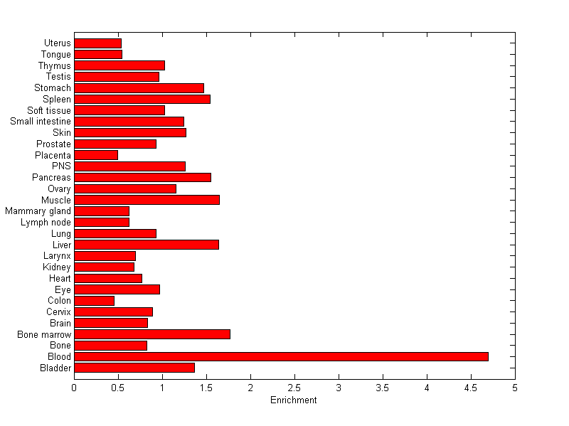 The expression level is normalized with tissue-library size. Each value for a gene in a tissue is a ratio of observed ESTs to the expected one in this tissue. The expected number of ESTs is the product of total ESTs of the gene and the fraction of total ESTs in the tissue among all ESTs in 30 tissues.