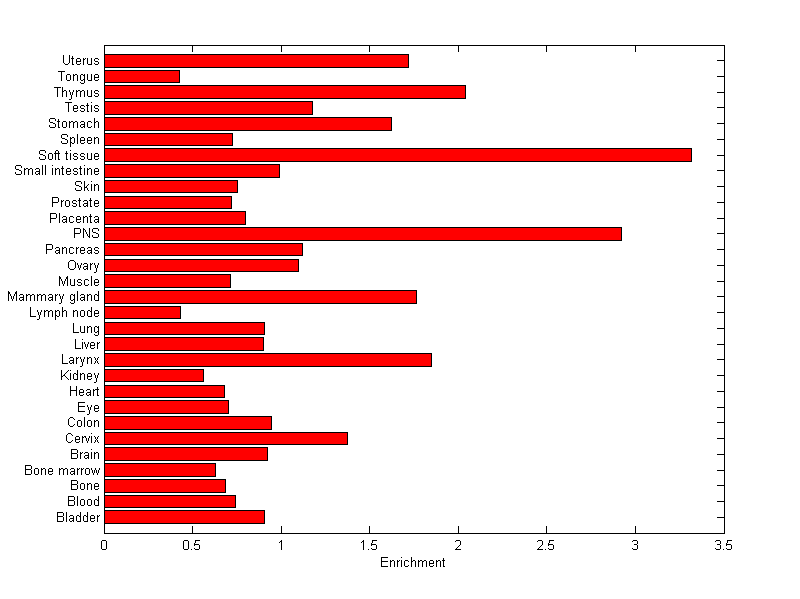 The expression level is normalized with tissue-library size. Each value for a gene in a tissue is a ratio of observed ESTs to the expected one in this tissue. The expected number of ESTs is the product of total ESTs of the gene and the fraction of total ESTs in the tissue among all ESTs in 30 tissues.