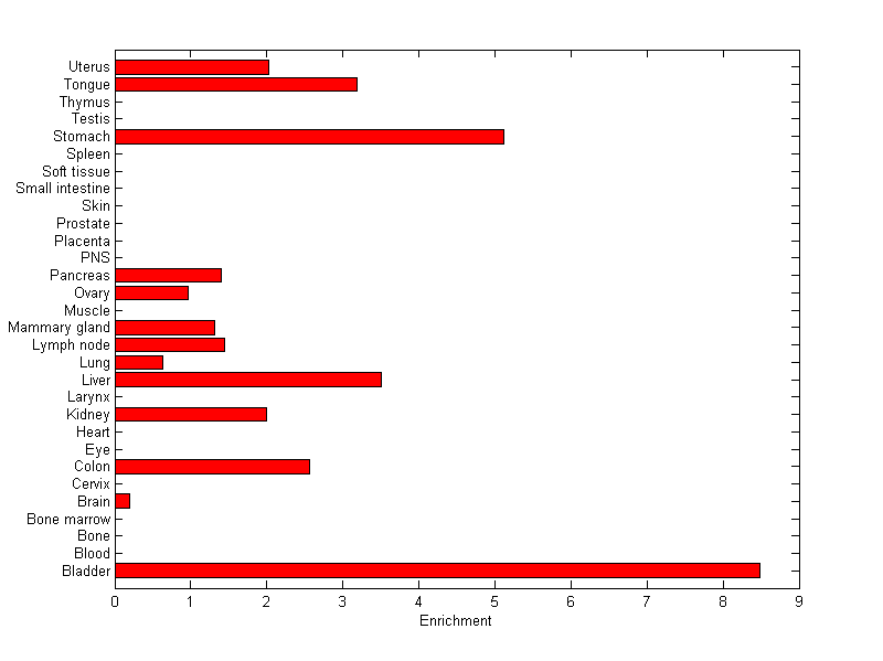 The expression level is normalized with tissue-library size. Each value for a gene in a tissue is a ratio of observed ESTs to the expected one in this tissue. The expected number of ESTs is the product of total ESTs of the gene and the fraction of total ESTs in the tissue among all ESTs in 30 tissues.