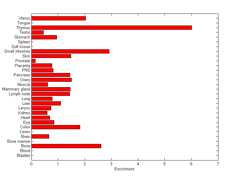 The expression level is normalized with tissue-library size. Each value for a gene in a tissue is a ratio of observed ESTs to the expected one in this tissue. The expected number of ESTs is the product of total ESTs of the gene and the fraction of total ESTs in the tissue among all ESTs in 30 tissues.