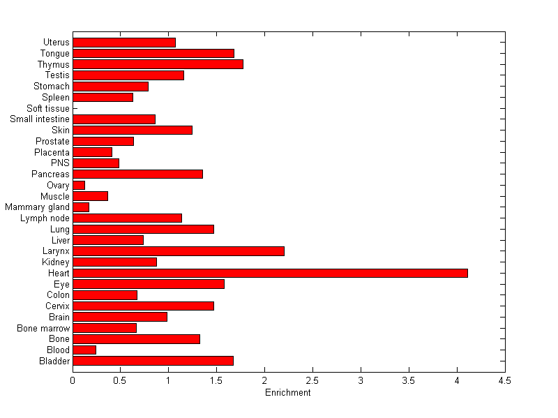 The expression level is normalized with tissue-library size. Each value for a gene in a tissue is a ratio of observed ESTs to the expected one in this tissue. The expected number of ESTs is the product of total ESTs of the gene and the fraction of total ESTs in the tissue among all ESTs in 30 tissues.
