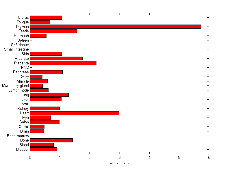 The expression level is normalized with tissue-library size. Each value for a gene in a tissue is a ratio of observed ESTs to the expected one in this tissue. The expected number of ESTs is the product of total ESTs of the gene and the fraction of total ESTs in the tissue among all ESTs in 30 tissues.