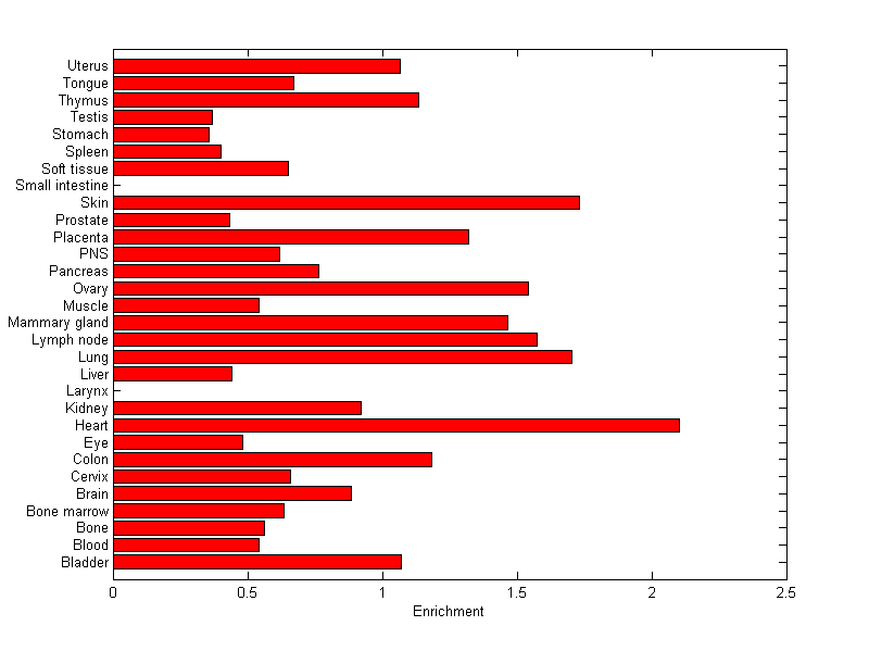 The expression level is normalized with tissue-library size. Each value for a gene in a tissue is a ratio of observed ESTs to the expected one in this tissue. The expected number of ESTs is the product of total ESTs of the gene and the fraction of total ESTs in the tissue among all ESTs in 30 tissues.