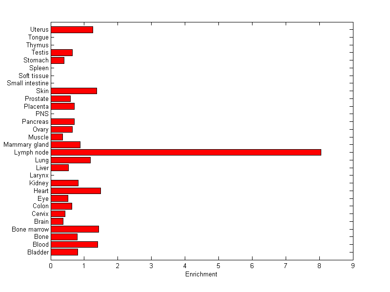 The expression level is normalized with tissue-library size. Each value for a gene in a tissue is a ratio of observed ESTs to the expected one in this tissue. The expected number of ESTs is the product of total ESTs of the gene and the fraction of total ESTs in the tissue among all ESTs in 30 tissues.