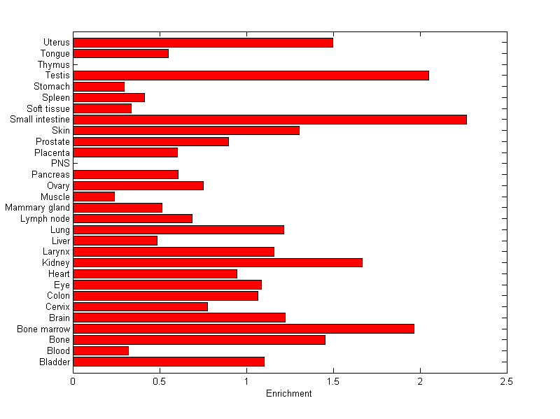 The expression level is normalized with tissue-library size. Each value for a gene in a tissue is a ratio of observed ESTs to the expected one in this tissue. The expected number of ESTs is the product of total ESTs of the gene and the fraction of total ESTs in the tissue among all ESTs in 30 tissues.