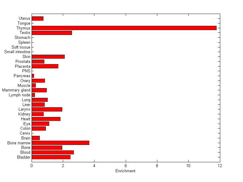 The expression level is normalized with tissue-library size. Each value for a gene in a tissue is a ratio of observed ESTs to the expected one in this tissue. The expected number of ESTs is the product of total ESTs of the gene and the fraction of total ESTs in the tissue among all ESTs in 30 tissues.
